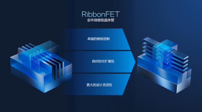 RibbonFET全环绕栅极晶体管为英特尔全新晶体管架构,采用了4条垂直堆叠的纳米带(NanoRibbons)结构,让栅极能够从四面包电流通道完全环抱起来,可增强晶体管开关控制、响应速度,并显著抑制漏电。同时,RibbonFET相比传统晶体管结构能够带来更好的可扩展性与设计灵活性,能够实现在同一个工艺平台上围绕高性能、低功耗等不同优化方向设计多种晶体管规格。