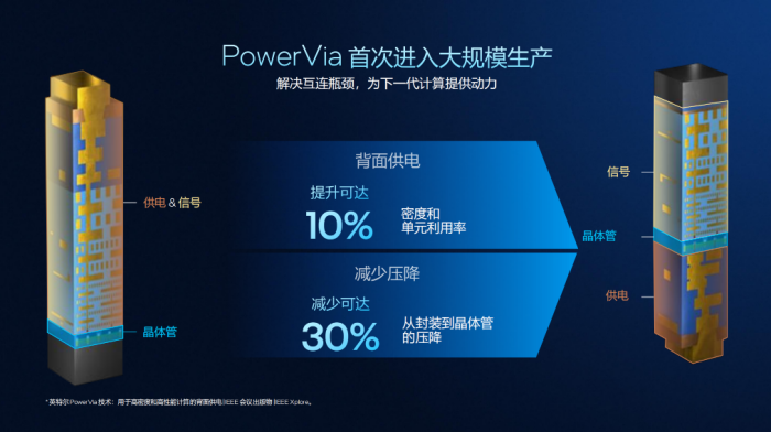 PowerVia背部供电简单理解是将以往位于晶圆正面的供电电路下沉到背面,在正面只保留信号互连部分,由此将标准单元利用率和晶体管密度提升可达10%,将压降(IRDrop)减少多达30%,将芯片运行效率最高提升6%。
