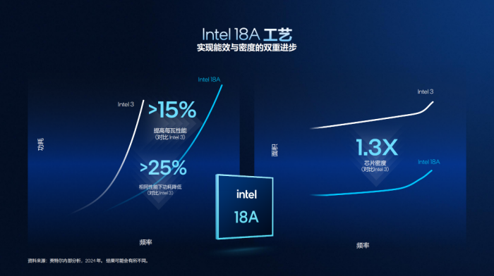 英特尔表示,凭借释放晶体管潜能的RibbonFET和扫清供电障碍的PowerVia两项技术,Intel18A的密度和能效同步提升。对比Intel3,Intel18A工艺在相同功耗下每瓦性能提升超过15%;相同性能下功耗降低可以达到25%。与此同时,Intel18A还将芯片密度提升了30%,意味着在更小的芯片尺寸,能够以更低的能耗发挥更强大的性能。