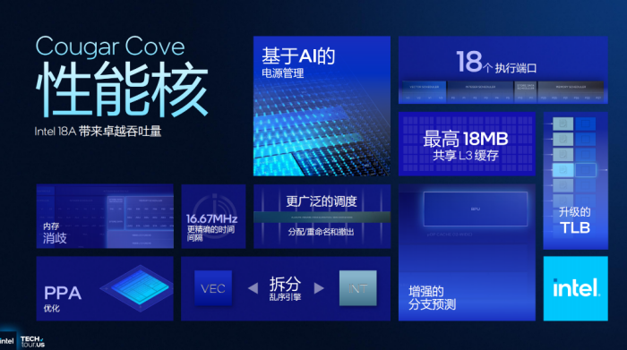 CougarCove拥有18个执行端口,带来了PPA(性能功耗与面积)优化、内存消歧、16.67MHz精确频率调节、更广泛的调度(分配、重命名与撤出)、增强的分支预测、升级的TLB、拆分乱序引擎等特性。对比LunarLake的LionCove,CougarCove带来了50%的L3缓存提升,达到18MB(与能效核共享)。此外,每个核心拥有192KB一级指令缓存、48KB一级数据缓存,最高3MB二级缓存。