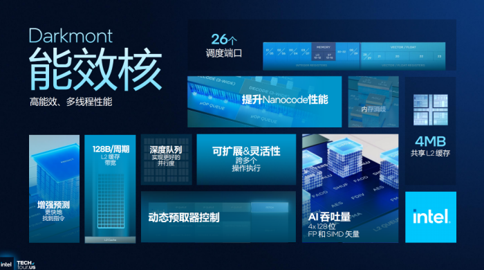 Nanocode性能提升指的是Darkmont能够覆盖多应用场景,进行精细到前端硬件执行小单元的控制,进一步提高硬件资源的利用效率,更好地发挥能效核性能与低功耗优势。