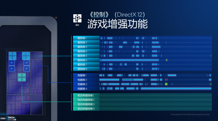 除了核心性能与能效提升,伴随着性能核、能效核一同成长的还少不了英特尔硬件线代酷睿发布后英特尔在优化平台能效方面持续迭代的特性之一。简言之,调度器就像是一个“指挥台”能够智能判断负载类型,交由更合适的核心执行或者判断负载的优先级。