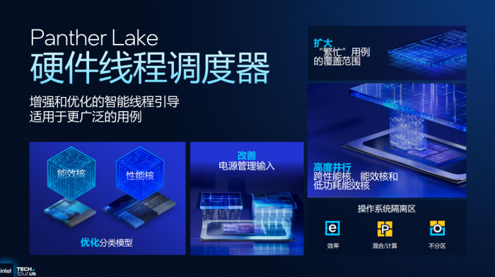 在PantherLake中,英特尔进一步升级了硬件线程调度器的分类模型和输入,让其能够根据PantherLake核心特性完成分类并向系统提供反馈。这背后的调整包括优化分类模型、改善电源管理输入、扩大“繁忙”用例覆盖范围、实现跨性能核、能效核、低功耗能效核的高度并行等等。同时,还设置了操作系统隔离区,结合负载以效率、混合/计算、不分区等分门别类地处理。