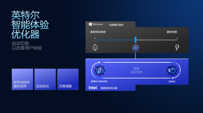 介绍一个关键特性——英特尔智能体验优化器(IntelligentExperienceOptimizer),其优势在于“省心的自动挡”。当系统处在平衡模式下,特别是离电场景中,英特尔智能体验优化器支持的智能自适应机制可以在后台根据实时工作负载,自动在预设的性能模式和更高效的节能模式之间进行无缝切换,无需手动调整。