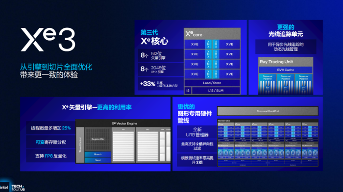 第三代Xe核心架构变化不大,提供8个512位XVE矢量引擎和8个2048位XMX引擎,均有增强;共享一级缓存容量也提升了三分之一,达到342KB。其中矢量引擎的线%,添加了可变寄存器分配、原生支持FP8反量化、SIMD16原生ALU、三路并发、扩展数据指令集与FP64,以及Xe矩阵扩展,由此带来使用效率提升,支持更多负载。