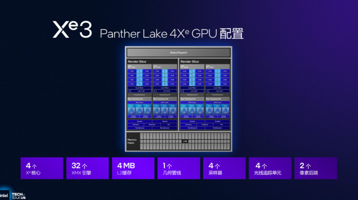 每个关键硬件和引擎的性能提升让Xe3全面优化。在Xe3的每个渲染切片中,英特尔将原本的4个Xe核心提升到了最多6个,并可搭配6个光追单元。且PantherLake的GPU提供两种规格:入门级的4XeGPU,以及性能最强、规模最大的12XeGPU,可为更高负载与AI应用提供支撑。