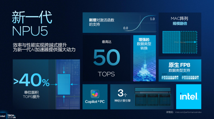 NPU5拥有最高50TOPS的算力。不过值得关注的是针对AI应用,英特持续发局CPU、GPU、NPU组成的XPU异构计算能力,且为不同负载匹配更高效的算力。全新PantherLake的平台AI算力最高能够达到180TOPS,其中CPU最高10TOPS,GPU最高120TOPS。
