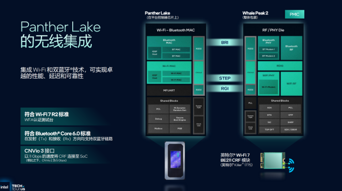 蓝牙6.0支持蓝牙信道探测、基于决策的广播过滤、监视广播设备、ISOAL(等时适配层)增强、LL扩展功能组、帧间隔更新等新特性,还有更好的蓝牙LE音频,比如Auracast广播能力。PantherLake还支持双蓝牙,通过在一个模块里集成两个蓝牙核心,实现性能翻倍,大幅提升速率、通信距离。