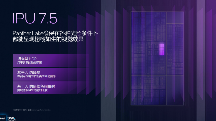 值得一提的是,IPU并非PantherLake中首次采用,从2014年推出第一代IPU至今,已经迭代到了IPU7.5,能够有更高能效,支持最多3个摄像头并发、1080P120Hz慢动作,同时为PantherLake带来了增强型HDR、AI降噪以及AI驱动局部色调映射三项创新特性。让用户在视频通话、直播等调用笔记本摄像头场景下,有更好的画面呈现。