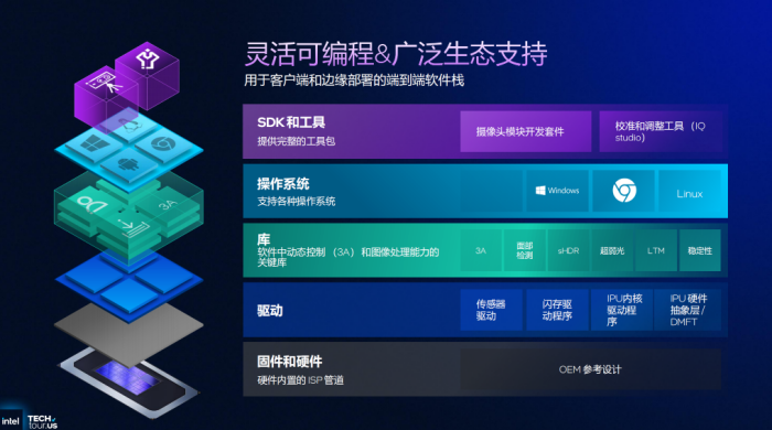 另外,英特尔还提供了硬件、OEM参考设计、驱动(包括IPU驱动、传感器驱动、闪存驱动)等完整的IPU软件和硬件堆栈,以及动态库,让整个解决方案可以支持Windows,谷歌的Chrome和Linux操作系统。此外还有完整的软件开发包,包括摄像头的开发模块,更容易在英特尔平台上实现校准和色彩的调校。