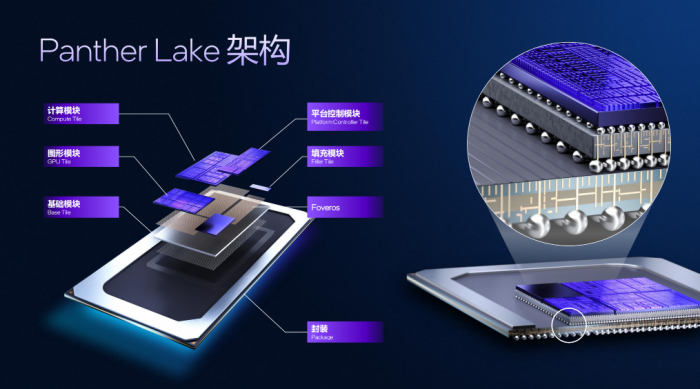 除了制程工艺,封装方面,PantherLake采用了成熟的Foveros-S2.5D,结合EMIB将不同模块堆叠封装在基础模块上,进而在兼顾能效的前提下,提供更好的可扩展性,实现芯片的灵活定制、成本可控。