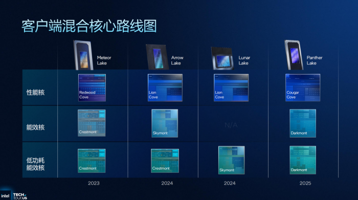 PantherLake的CPU设计又回归了性能核、能效核、低功耗能效核的组合,并且升级了架构——性能核代号为CougarCove,能效核与低功耗能效核代号为Darkmont,均围绕Intel18A工艺进行设计和优化。英特尔表示,PantherLake混合核心策略为,性能核提升单线程性能核吞吐量,能效核提升多线程性能核并行度,低功耗能效核则提高效率。