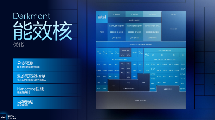 Nanocode性能提升指的是Darkmont能够覆盖多应用场景,进行精细到前端硬件执行小单元的控制,进一步提高硬件资源的利用效率,更好地发挥能效核性能与低功耗优势。