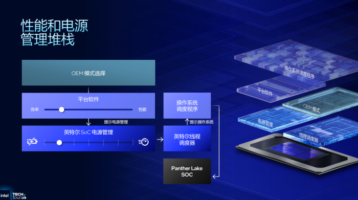 刚刚提到的CPU灵活可扩展、硬件线程调度器等特性,让OEM可以根据对产品的理解和定位来选择对应的性能释放,这个其实大家也很熟悉就是笔记本厂商自定义的各种性能模式、增强模式、静音模式、均衡模式。在软硬件协同方面,英特尔还做了一件事——提供统一性能和电源管理堆栈,支持OEM根据自身的需求来灵活调整。