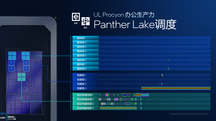 由于PantherLake全新架构将性能核、能效核、低功耗能效核集成在一个计算模块内,针对不同负载的调用更高效也更灵活。例如轻办公应用,低功耗能效核就能够应对,偶尔会调用性能核、能效核;有影像创作等负载需求时,则会进一步调用性能核;针对更高负载的情况,则会“不分区”全部投入使用,来发挥多线程性能优势。