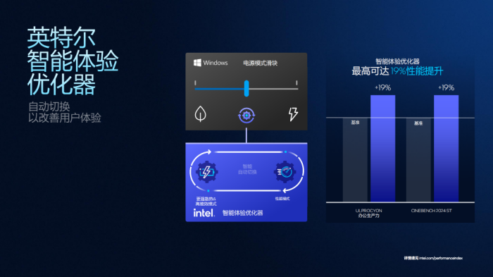 并且,英特尔表示英特尔智能体验优化器为系统内置,不依赖于特定的操作系统版本或外部IP。只要是搭载PantherLakeSoC的设备,在选择平衡模式时,均可享受到系统根据实时负载智能调配性能与能效。根据英特尔公布的测试成绩,在CineBench2024单线程性能测试、ULProcyon办公生产力测试中,英特尔智能体验优化器能够带来最高19%的性能提升。