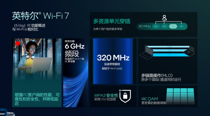Wi-Fi7R2主要提升了网络性能、可靠性和能效,包括多连接重配置、受限TWT(目标唤醒时间)、单链接eMLSR(增强多连接单射频)、P2P通道协调、MIMO增强、混合自动重复请求(HARQ)、低延迟操作等。与Wi-Fi6相比,英特尔Wi-Fi7能够提升连接性能、可靠性、安全性,并降低延迟。