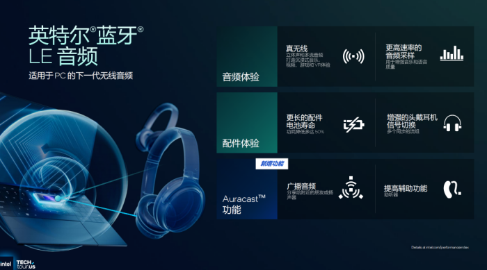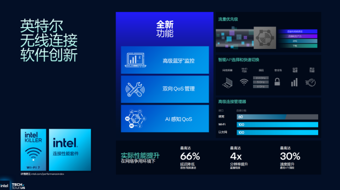 蓝牙6.0支持蓝牙信道探测、基于决策的广播过滤、监视广播设备、ISOAL(等时适配层)增强、LL扩展功能组、帧间隔更新等新特性,还有更好的蓝牙LE音频,比如Auracast广播能力。PantherLake还支持双蓝牙,通过在一个模块里集成两个蓝牙核心,实现性能翻倍,大幅提升速率、通信距离。