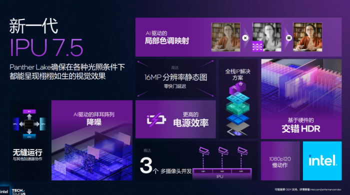 值得一提的是,IPU并非PantherLake中首次采用,从2014年推出第一代IPU至今,已经迭代到了IPU7.5,能够有更高能效,支持最多3个摄像头并发、1080P120Hz慢动作,同时为PantherLake带来了增强型HDR、AI降噪以及AI驱动局部色调映射三项创新特性。让用户在视频通话、直播等调用笔记本摄像头场景下,有更好的画面呈现。