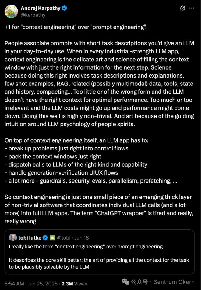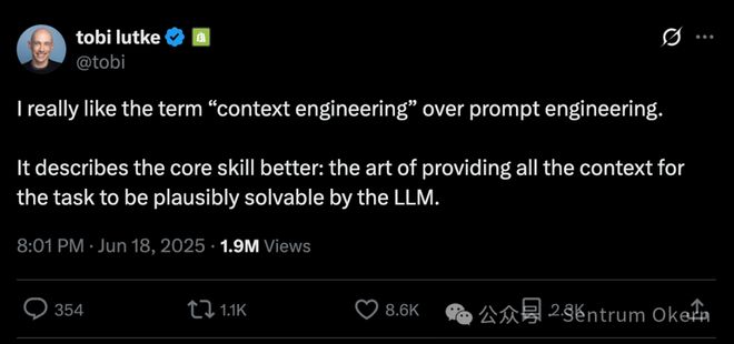 与“提示工程”(Prompt Engineering)相比,我更喜欢“上下文工程”(Context Engineering)这个术语。 它能更好地描述这项核心技能:一门为大语言模型(LLM)提供充分的上下文信息,使其有能力合理地解决任务的艺术。