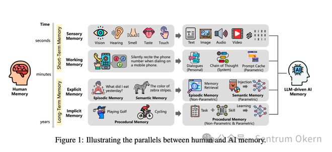 依照上文提到的人类的记忆结构,下面这张图很清晰地对比了人类和 AI 记忆的结构和分类。这张图来自华为诺亚方舟实验室发表的《从人类记忆到 AI 记忆:LLM时代记忆机制的调查》论文,很好地图谱化解释了人类和 AI 记忆的分类,并引入了一种 AI 记忆的三维结构,超越了仅仅的时间维度(短期与长期),而同时考虑了记忆的对象(个人vs.系统)及其形式(参数化vs.非参数化)。