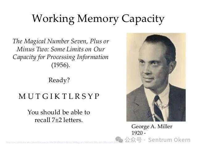 人类记忆的限制更多依赖于组织方式而非存储空间:美国心理学家 George A. Miller(1920-2012,认知心理学的奠基人之一)在一篇论文中回顾了许多实验,发现无论是在短时记忆还是区分刺激(如音调、亮度、颜色)的任务中,我们的短期记忆似乎都有一个极限:大约能同时处理 7 个单位(信息块),上下浮动 2 个。于是他提出了著名的神奇的数字7±2。