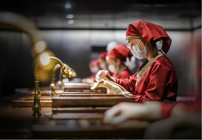 阿胶的制作工艺极其讲究,擦胶、翻胶、晾胶这些工序,几乎都要靠匠人手工完成。其中“擦胶工艺”已被列为国家级非物质文化遗产。